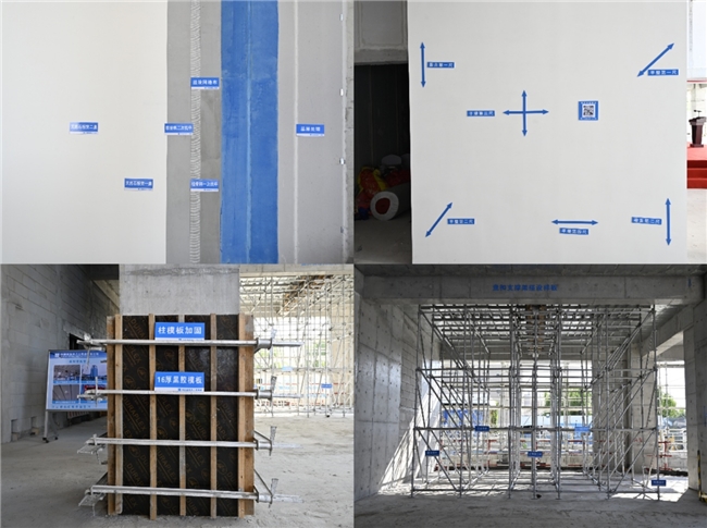 项目部细化落实设计要求,根据国家及地方标准、行业经验,在设计及施工阶段提出涉及防水、机电安装、屋面等细部构造等优化的建议,例如基坑肥槽采用流态固化土回填施工工艺,利用流态固化土流动性强、自密实、安定性佳的特点解决了狭小空间内素土回填不密实、易沉降及形成存水空腔的问题,极大程度预防了后续地下室外墙渗漏问题;混凝土结构采用盘扣方钢支模体系及方圆扣夹具加固体系,结构一次成型外观质量好,结构尺寸偏差小;高低标号混凝土拦截采用镀锌鱼鳞钢网片加充气棒组合形成拦截措施,有效避免高低标号混凝土混浇的问题,拦截效果佳;根据工程特点及难点,梳理关键工序及特殊施工部位,分门别类制定相应措施。在各项工序施工前做好专项工程的深化设计及确认工作,协调解决各专业施工的先后顺序及工序穿插避让工作,严格把控,确保施工一次成优。