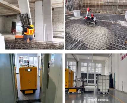 AGV无人物料配送机器人适配施工电梯等狭窄空间,实现建材从仓库到作业面的自动化运输,构建“无人化”物流闭环;