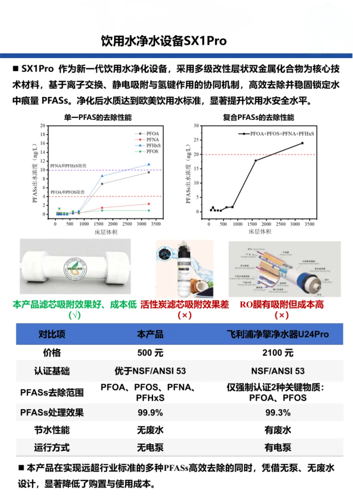 相较于传统净水产品,SX1Pro在性能、成本与环保性上实现三重突破。与同类产品相比,SX1Pro价格低廉且认证标准优于NSF/ANSI 53,去除PFASs种类更全面(覆盖4种核心物质,而非仅2种强制认证物质);在使用体验上,设备创新采用无电泵、无废水设计,既降低了运行能耗与使用成本,又避免了水资源浪费,完美契合“绿色人居”理念;对比传统活性炭滤芯吸附效果差、RO膜成本高的痛点,SX1Pro的LDHs滤芯吸附效果更强、性价比更高,为家庭饮用水净化提供了更优解。