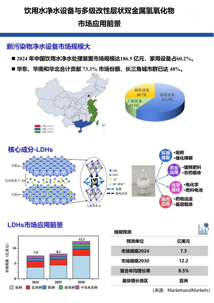 当前,净水设备市场需求持续旺盛。2024年中国饮用水净水处理装置市场规模已达186.5亿元,其中家用设备占比60.2%,华东、华南、华北三大区域贡献73.3%市场份额。作为设备核心成分的LDHs材料,应用场景更趋多元,涵盖环境修复、农业、化学催化、医药等多个领域。据市场预测,2024年全球LDHs市场规模达7.5亿美元,2030年将增至12.2亿美元,复合年均增长率8.5%,其中亚洲地区增长最快。中建八局环科公司凭借在LDHs材料改性与应用上的技术积累,实现了核心材料与终端设备的协同创新,既抢占了净水设备细分市场的先机,也为LDHs材料的产业化应用开辟了新路径。
