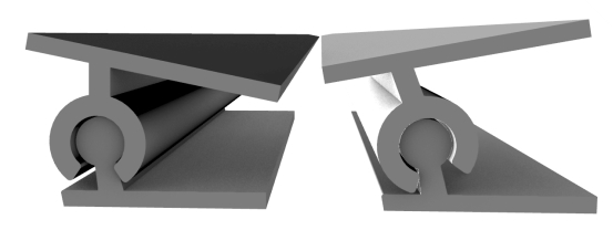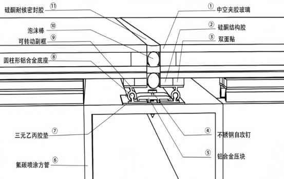 转接件主要由可转动副框和圆柱形铝合金底座两部分组成。底座通过压块和自攻钉与主龙骨固定,副框则通过双面贴和结构胶与玻璃结合。其创新性在于:通过对玻璃施加轻微作用力,副框可在底座内实现灵活微转,从而主动适应并消除龙骨安装偏差。
