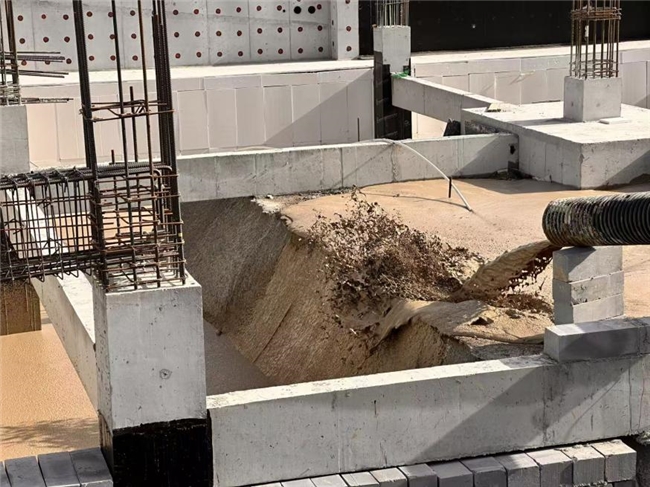 这种“量身定制”的流态固化土,在施工中展现出显著技术优势。针对基坑内桩基密集、管线交错的复杂环境,浆体通过高压泵输送时可灵活调整流速,顺着狭小间隙自然扩散,形成无缝填充效果。完成浇筑的回填区域表面平整,无需后续振捣处理。