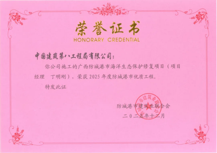近日,防城港市建筑业联合会公布2025年防城港市优质工程项目名单,中建八局环保科技有限公司承建的广西防城港市海洋生态保护修复项目,凭借卓越的工程质量与显著的生态效益,成功斩获防城港市优质工程奖,成为行业内生态修复类项目的标杆之作。