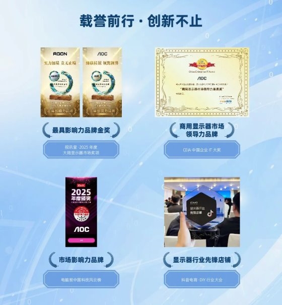 持续深耕专业市场,创新赋能产业发展!作为全球知名显示设备提供商,AOC始终秉承多年来对视讯产业的专业、专注与专精。面对激烈的市场环境,AOC坚定践行“向上卷”的核心战略,以技术创新打破内卷,以品质升级重塑价值。在产品布局上,全面聚焦OLED、Mini LED、Eye Care、Double双模等“4E”前沿技术,持续打磨“高画质、高分辨率、高刷新率”的三高品质;在AI智能维度,以前瞻布局推出AI显示器、AI智联机、AI TV等创新矩阵,为设备注入智慧内核。通过以新质生产力驱动技术迭代,AOC正引领显示产业迈向“智”与“质”的双重进化。此次荣膺多项年度品牌大奖,既是市场消费者、行业媒体及权威专家对AOC的高度认可,更是品牌强大综合实力的有力见证!